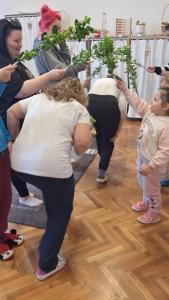 Először furulyaszóval előhívtuk a Tavasztündért, akivel egy közös, kendős táncot lejtettünk. Majd zöldleveles gallyakkal eljátszottuk a Bújj, bújj zöld ág kezdetű gyermekjátékot. A tenyerünkbe bazsarózsát „ültettünk”, ezután pedig igazi virágmagokat vetettünk nagy kupakokba, amit mindenki hazavihetett magával. Amíg kikelnek a magok, addig is legyen virágunk, tulipánokat festettünk, amiket szintén hazavihettek a gyerekek. A foglalkozás végén Horváthné Ildikó meglepett bennünket frissen kikelt kiscsibéivel, amiknek a legzárkózottabb gyermek sem tudott ellenállni. Nagy örömmel csodálták a gyerekek az apró csibéket.