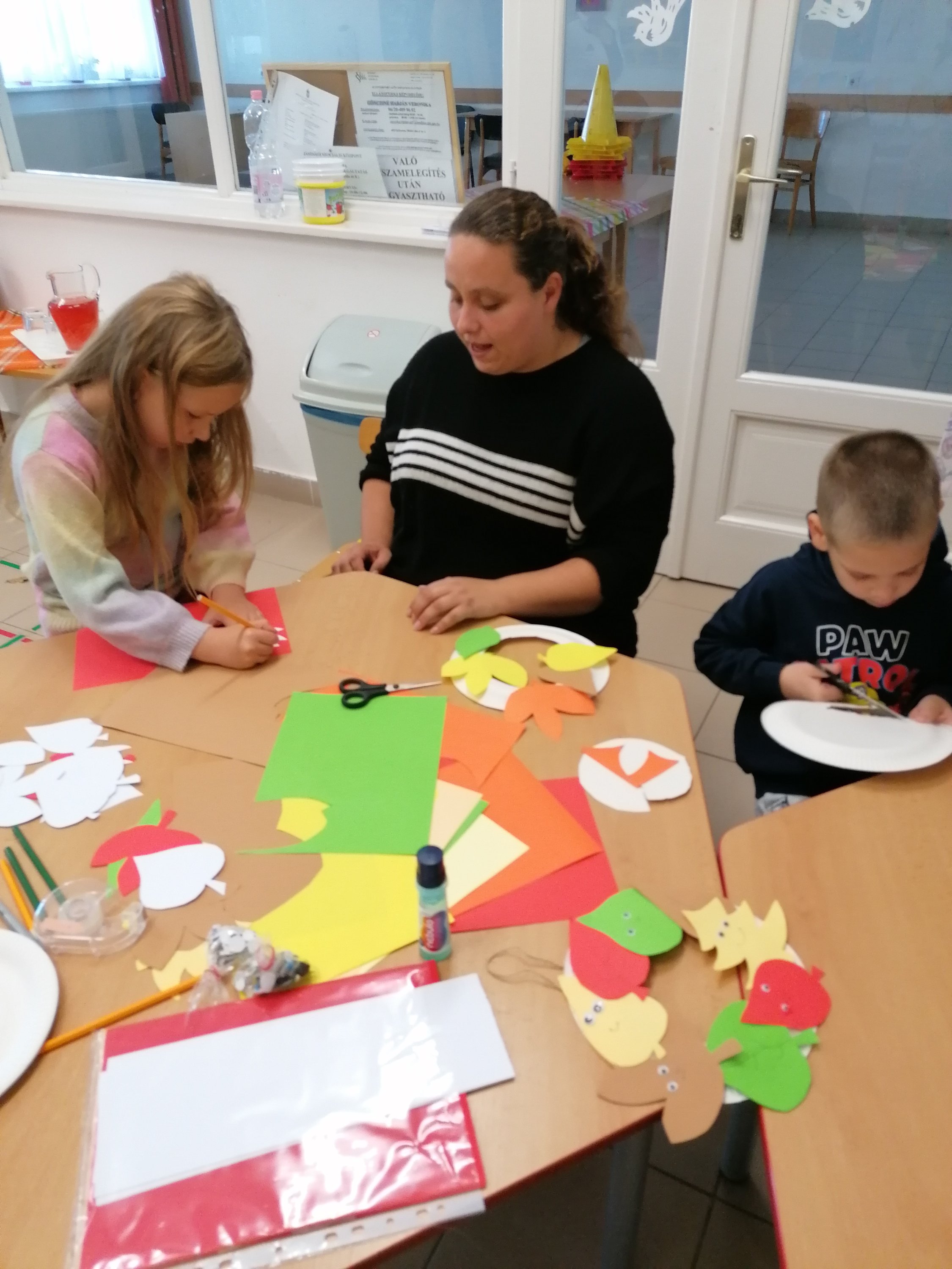 Az idén október 20-án délutánra vártuk a családokat telephelyünkre. Az ellátásunkban levő gyerekek testvéreikkel, szüleikkel tölthettek egy tartalmas délutánt. A résztvevők színes papírból kivágott falevelekből ajtódíszt készítettek, mely során elkélt a szülői segítség. Barkácsoltak gesztenyéből és fogpiszkálóból sünit, öröm volt látni, hogy a kis kalapácsokkal milyen lelkesedéssel dolgoztak a gyerekek. Nem maradhatott el a közös társasjátékozás, valamint a csapatok közötti sorversenyzés sem. Felnőttek és gyerekek együttesen ügyeskedtünk a győzelem reményében. A foglalatosságok közepette hónapsorolót mondókáztunk, színeztünk, beszélgettünk, jókat nevettünk és mindenkinek jólesett néhány falat süti és a tea. Büszkén vitték haza az elkészült portékákat a mosolygós gyerekek.
